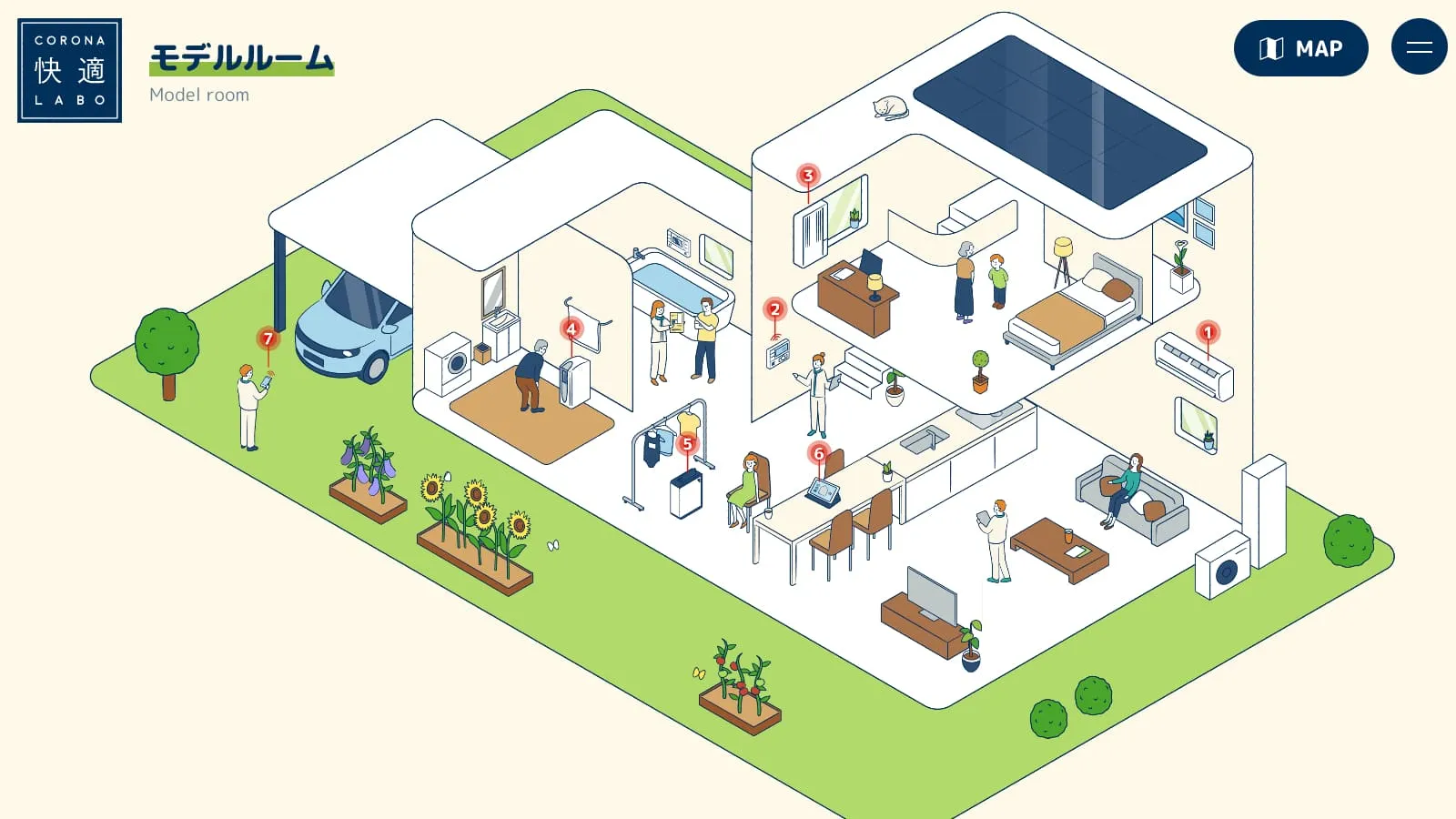 ・「快適LABO」の世界にふわりと降り立つオープニングなど、訪れた人たちがこの世界観により没入し楽しめるように細部までこだわり、心地よい動きをデザイン。 ・本サイトではコマアニメーションを多用しているため、そのまま構築すると重いサイトになりローディングに時間がかかる状況でしたが、軽快に表示されるよう様々な工夫をし調整しました。