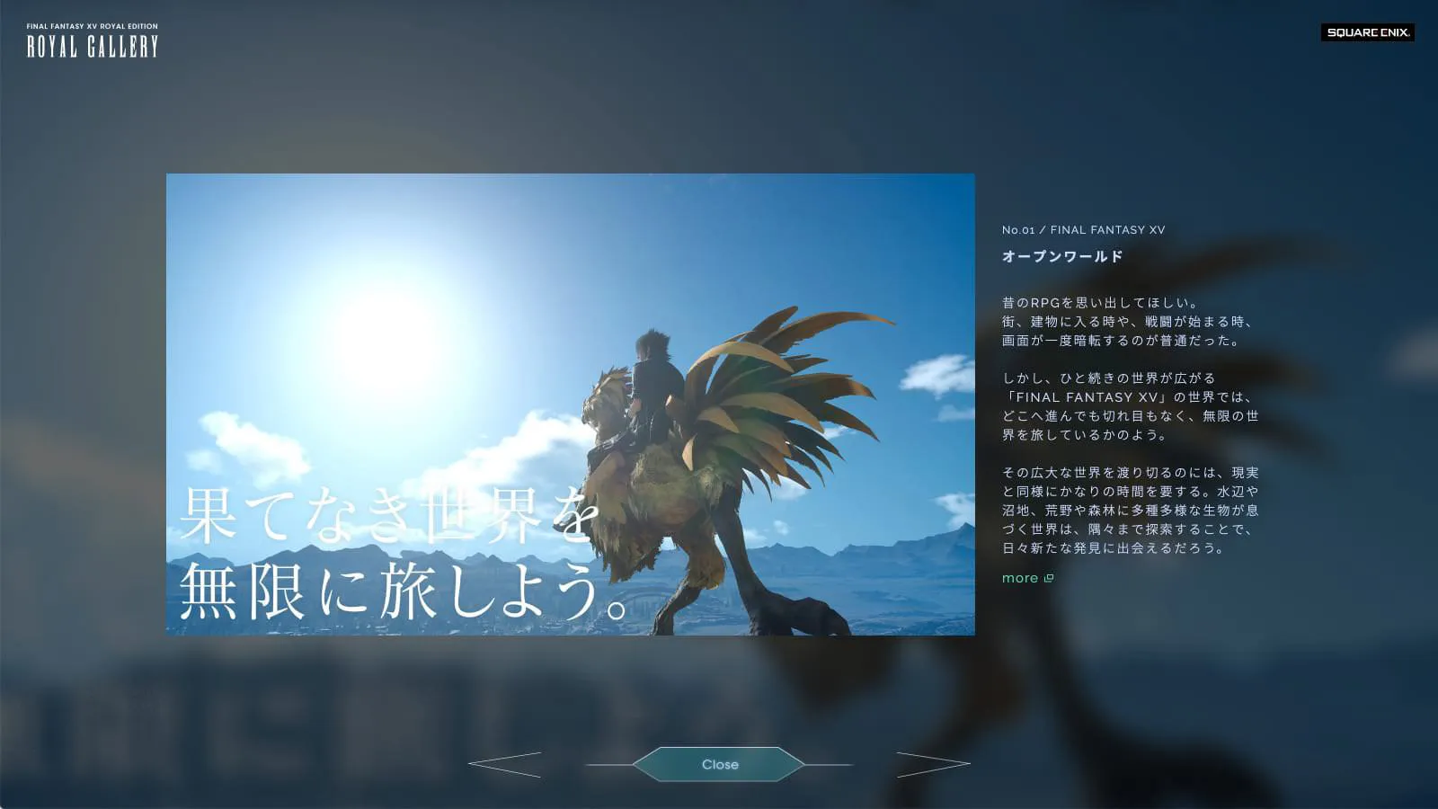「FINAL FANTASY XV ROYAL EDITION」の発売に合わせた、「FINAL FANTASY XV」の世界観を表現した特設サイトの制作。 「FINAL FANTASY XV」の魅力的なシーンとコピーで構成したバナー画像を約30点デジタルメディアに出稿。その広告によって、「FINAL FANTASY XV」の魅力・世界観が伝わるよう、魅力的なシーンとコピーで構成したバナー画像を、クリスタルの破片が舞っている表現をしました。 海外のwebメディア掲載や、awardを受賞しています。