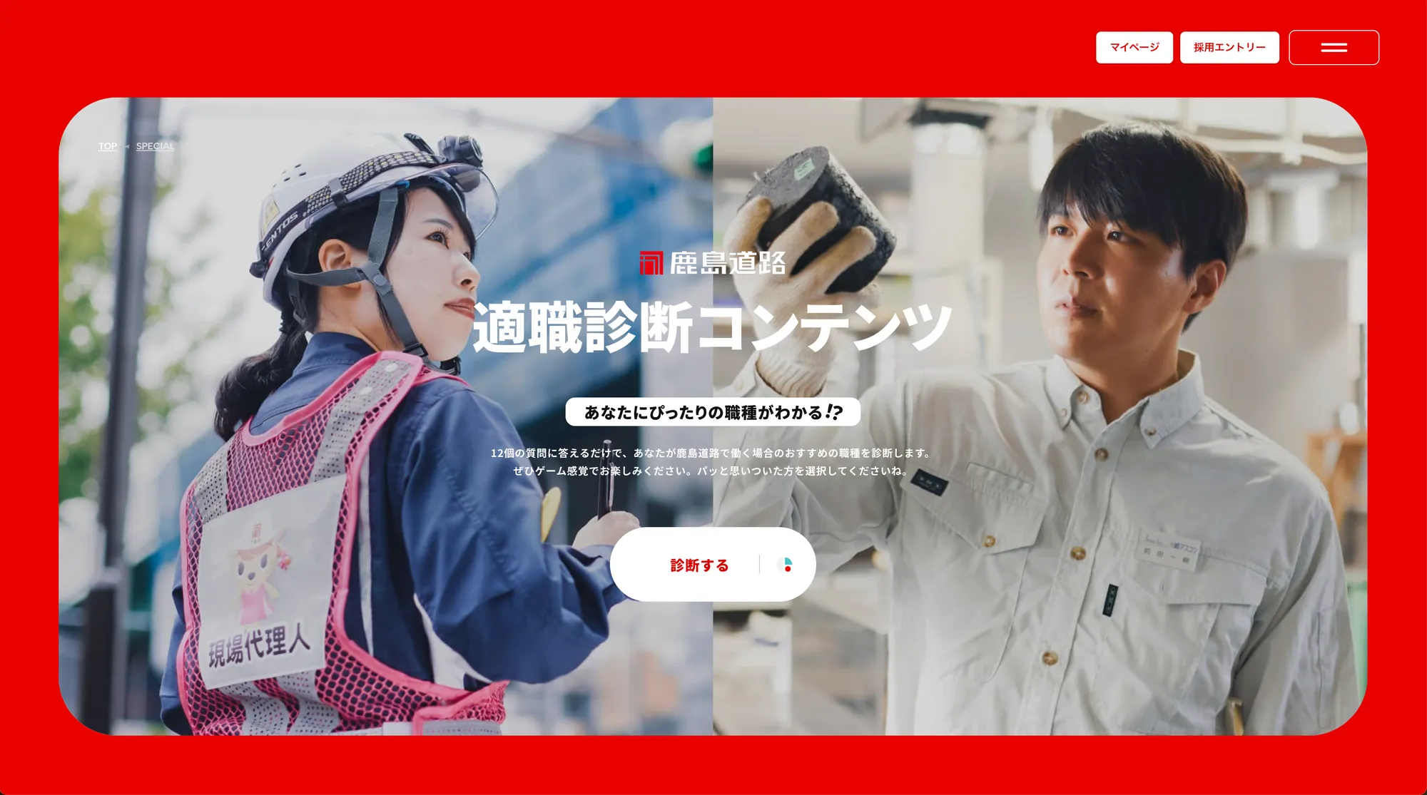 大手建設・道路工事会社のリクルートサイトをフルリニューアルしました。採用エントリーへの導線設計から、求職者が自分に合った職種を発見できる「適職診断コンテンツ」の開発まで、採用体験全体をデザインしています。