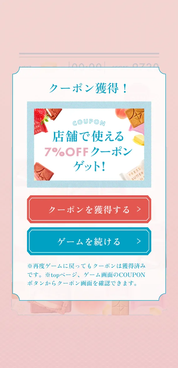 株式会社BAKEが展開しているバターサンド専門店「PRESS BUTTER SAND」のPRゲームを制作いたしました。 同社の商品をくっつけて高得点を狙うゲームを制作し、キャンペーンサイトに掲載しました。ゲームをプレイすると同社の商品の割引クーポンが手に入る仕様にしており、店舗への集客と商品の販売促進につなげています。 ゲームのプレイ数は10,000回を超え、多くのユーザーにブランドや商品の認知を広げる結果となりました。また、クーポンの表示回数は17,000回以上となり、店舗への誘導、商品の販売促進にも成功しました。
