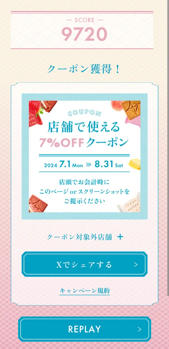 夏キャンペーンを盛り上げるためのゲームコンテンツ「BUTTERなサマーゲーム」を制作しました。このゲームは、商品の材料となる素材や商品同士をくっつけてプレスバターサンドを作り上げるゲームとなっています。 このゲームをプレイすると、ユーザーは会計時に使える割引クーポンが手に入ります。また、ゲーム結果をXに投稿することでのプレゼントキャンペーンも同時で実施しました。その結果、プレイ結果がXで拡散され、多くのユーザーからのインプレッションを獲得しました。 ゲームをプレイすることで楽しみながら商品理解を深まることだけでなく、クーポンでの商品の販売促進、SNS投稿キャンペーンでの商品認知拡大を狙っています。