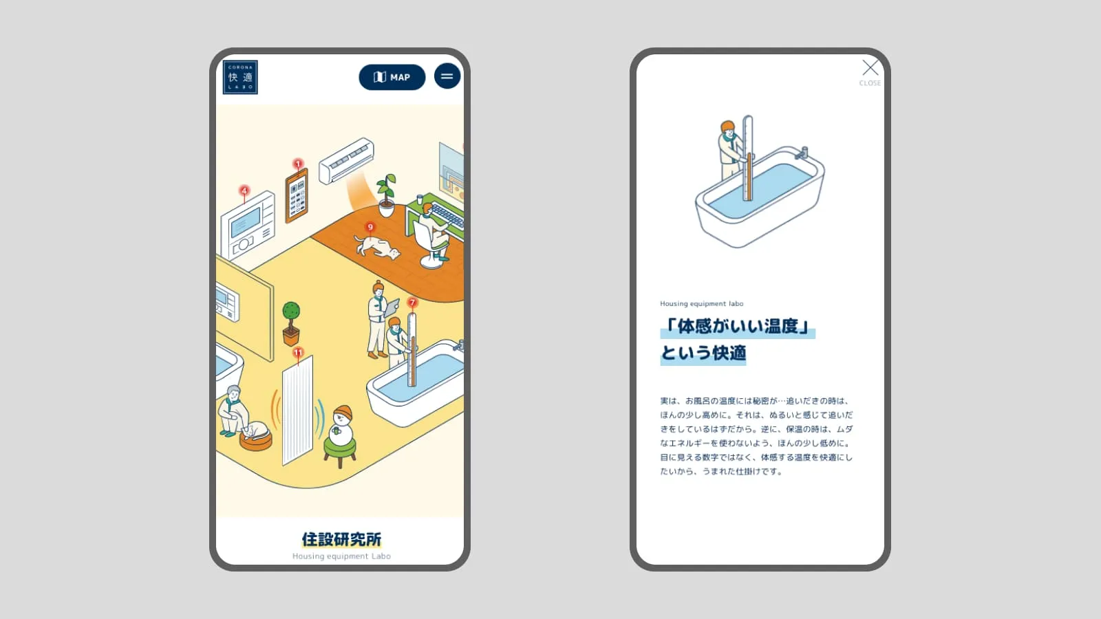 ・「快適LABO」の世界にふわりと降り立つオープニングなど、訪れた人たちがこの世界観により没入し楽しめるように細部までこだわり、心地よい動きをデザイン。 ・本サイトではコマアニメーションを多用しているため、そのまま構築すると重いサイトになりローディングに時間がかかる状況でしたが、軽快に表示されるよう様々な工夫をし調整しました。