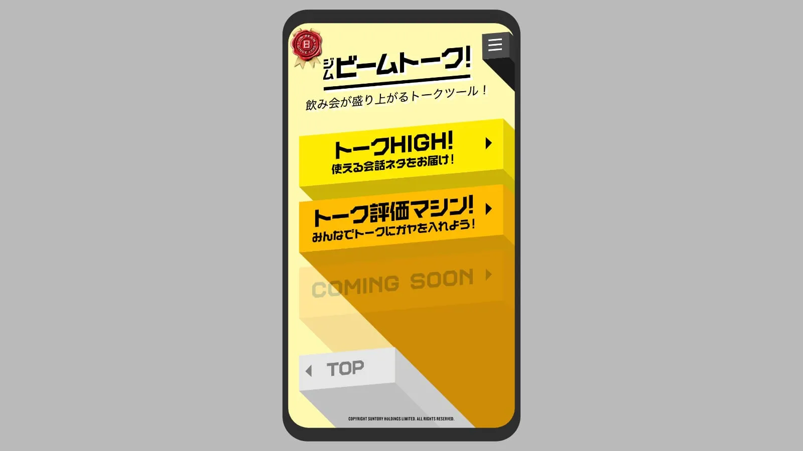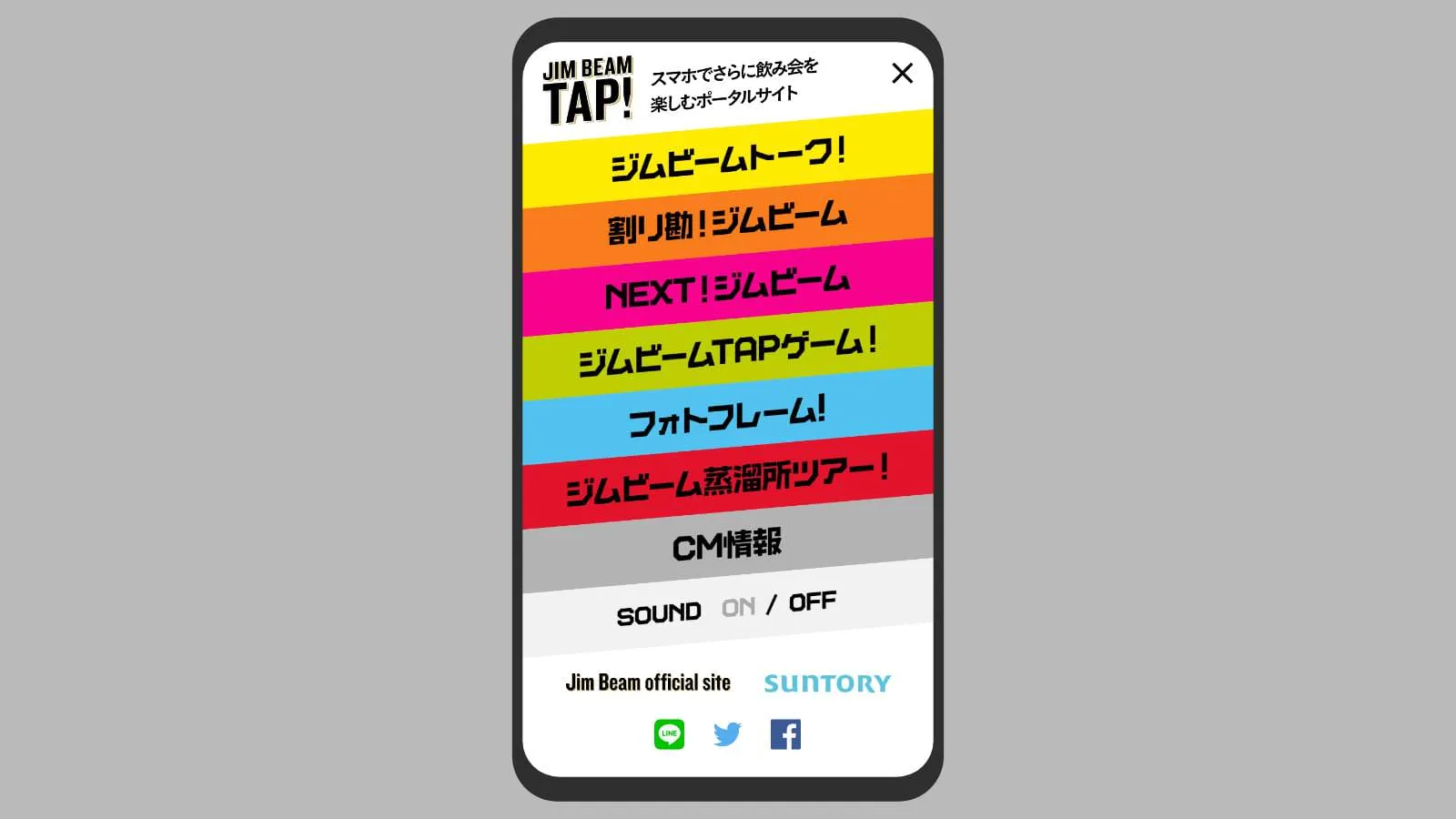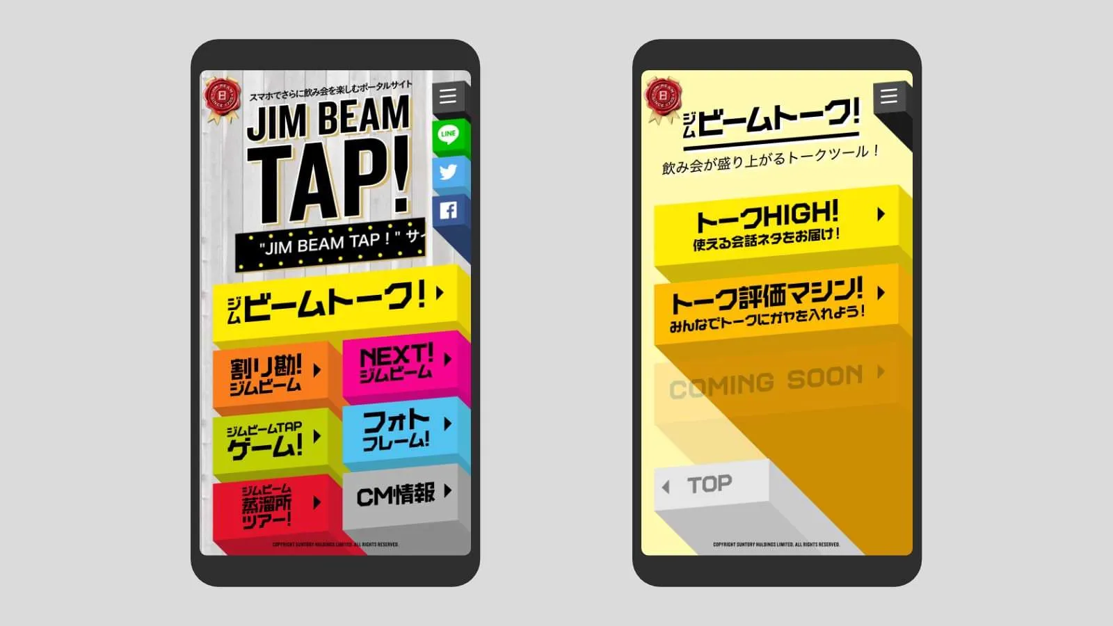 ジムビームが世界初QRコード付きジョッキをリリース。そのQRのリンク先として制作したサイトです。 店頭でジムビーム ハイボールを注文すると、ジョッキについているQRから専用サイトである「JIM BEAM TAP!」にアクセスできます。 飲み会をさらに盛り上げ、その場のコミュニケーションを推進させるサイトを企画制作することで、スマホを片手に楽しむ新しい飲み会のスタンダードを提唱しました。