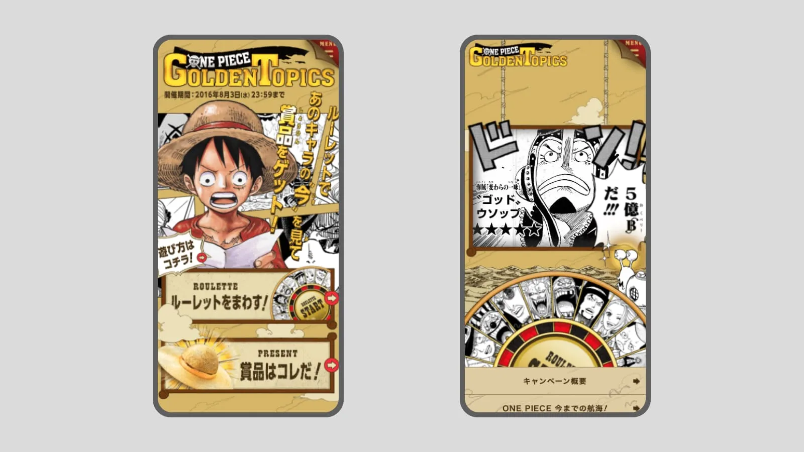 多彩なキャラクターのTOPICSを凝縮 スマートフォンサイトからルーレットを回すと、様々なキャラクターのTOPICS(ストーリー)を見ることができ、アタリが出ると賞品をGETすることができる期間限定のコンテンツです。 『ONE PIECE』ファンの心をくすぐる演出を細部にまで込めました。