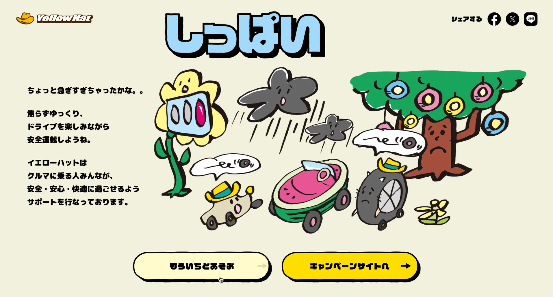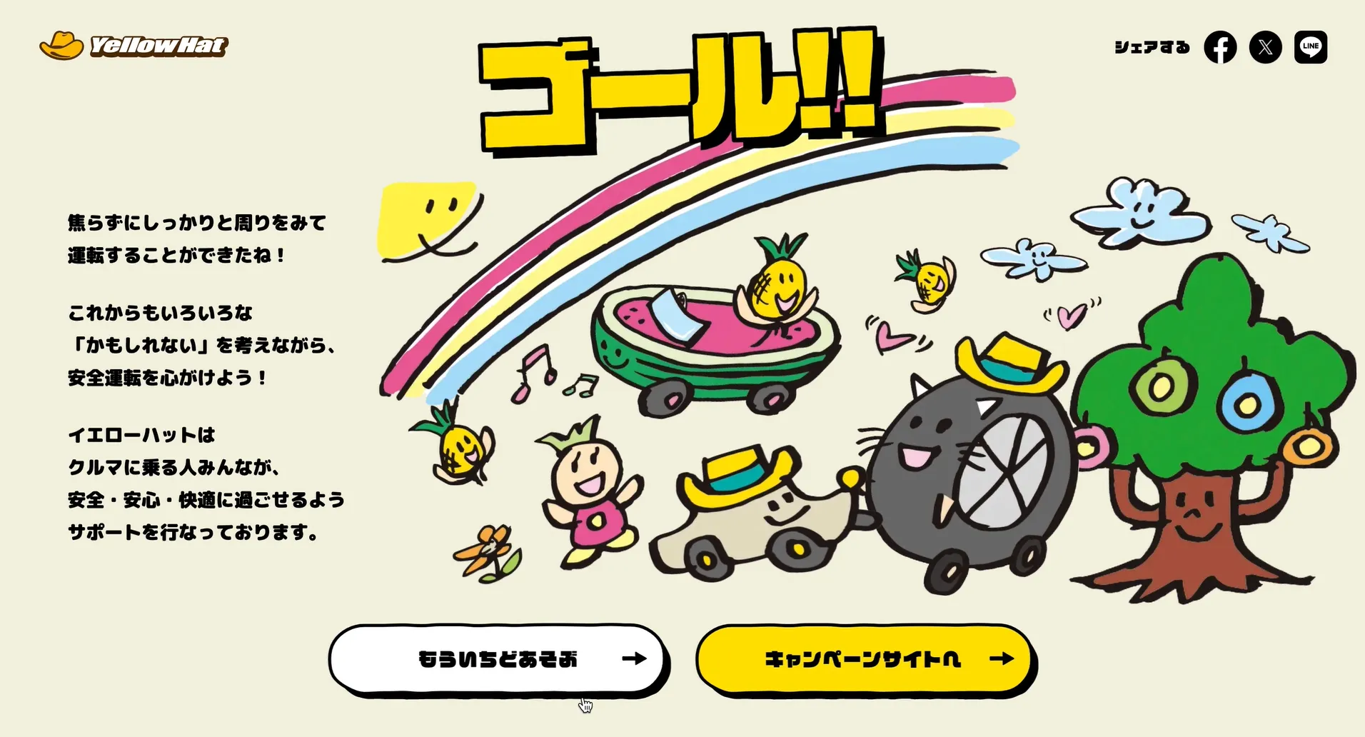 株式会社イエローハットの交通安全キャンペーンサイトを制作しました。 制作したキャンペーンサイトでは、交通安全を啓蒙するキャンペーンサイトを制作することに加え、「かもしれない運転」をテーマにしたゲームコンテンツを制作し、サイトで遊べるようにしています。 かもしれない運転をテーマとしたゲームコンテンツをキャンペーンに盛り込むことで、キャンペーンのテーマである交通安全の啓蒙をユーザーに体験してもらう形で実現しました。また、同時に行ったSNSキャンペーンでは、1000万を超えるインプレッションを獲得しています。
